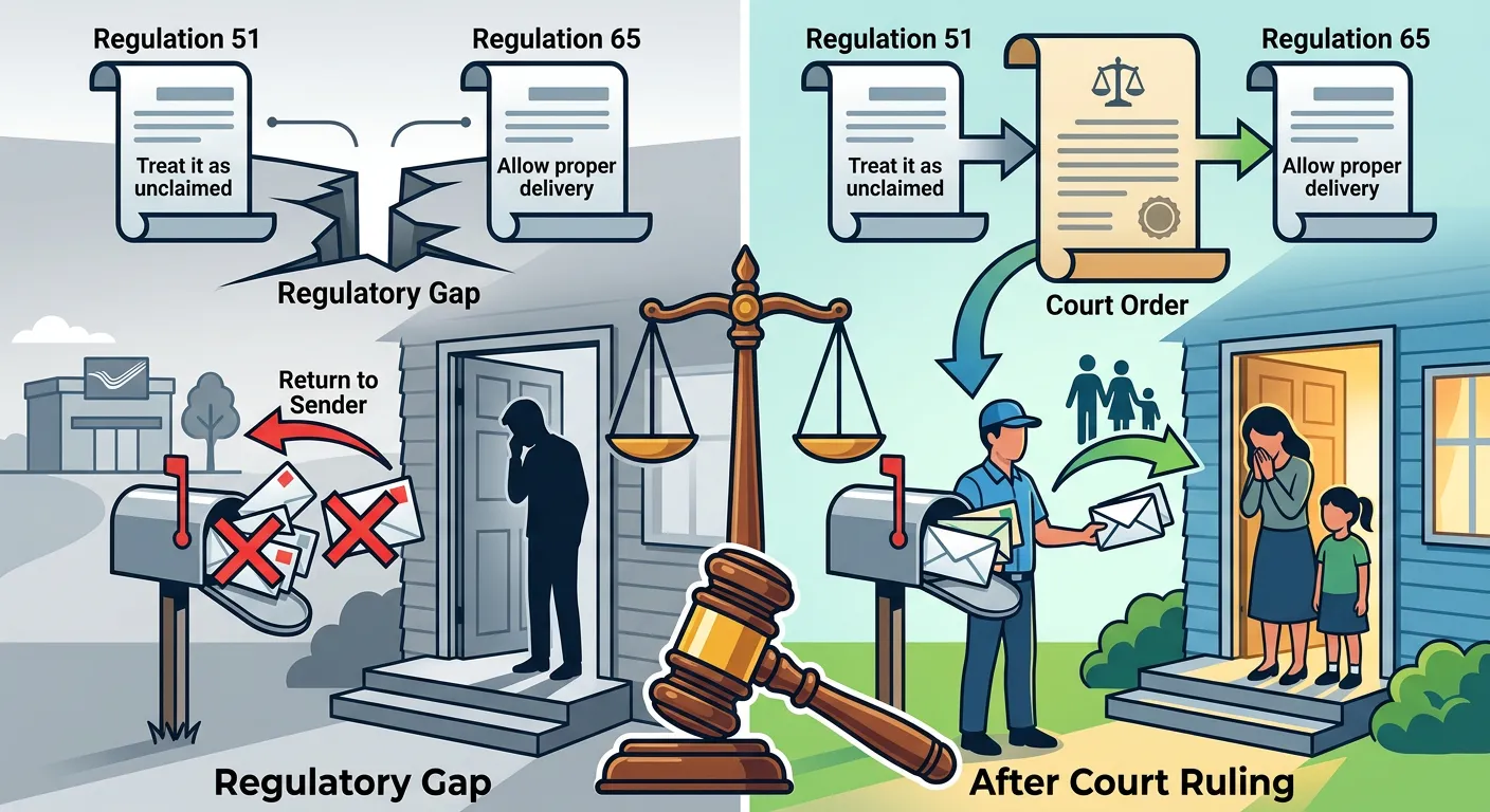 Regulation 51 of the Post Office Regulations, 2024, which treats mail addressed to a deceased person as unclaimed, must be read harmoniously with Regulation 65(1)(c), which permits delivery to persons to whom the item can properly be delivered. Return to sender arises only where no such person exists at the address. Legal heirs of a deceased addressee residing at the same address fall within the category of persons to whom items can properly be delivered. Administrative instructions cannot supplant subsidiary legislation and must be read in accordance with the scheme of the Regulations. A regulatory gap exists in defining the category of such persons, causing implementation confusion, but the provision is not ultra vires the Post Office Act, 2023, or Article 14 of the Constitution.