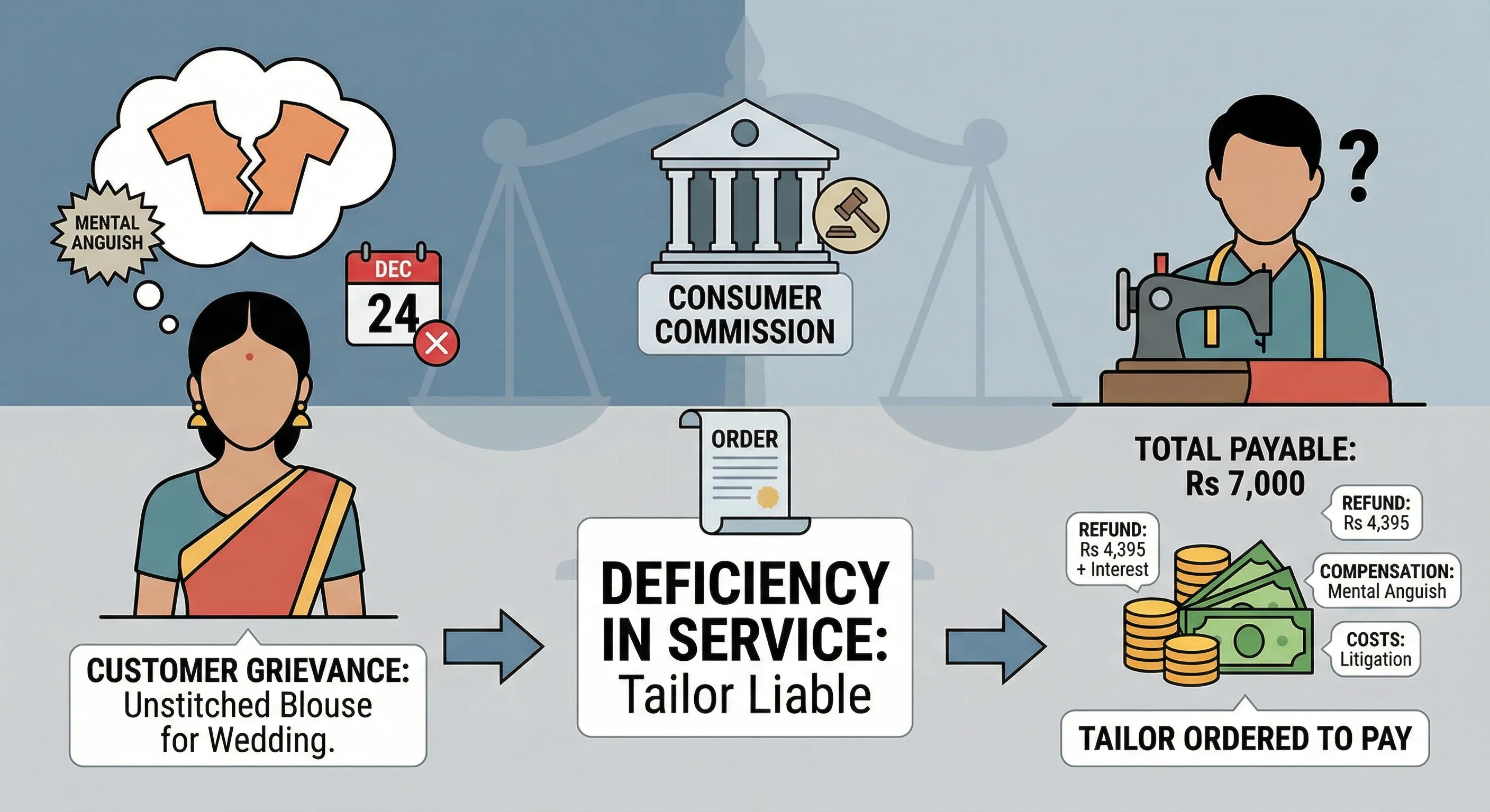 The tailor's failure to deliver the blouse by the agreed date despite receiving advance payment constituted deficiency in service and caused mental anguish to the customer.